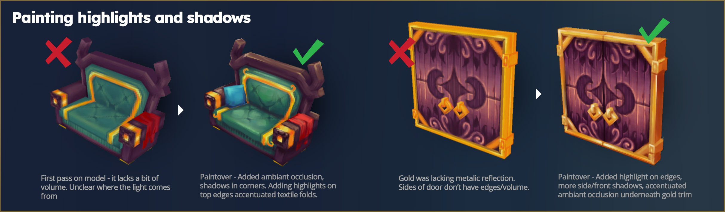 • Peignez les ombres et lumières : ne comptez pas uniquement sur l’éclairage dynamique du moteur.