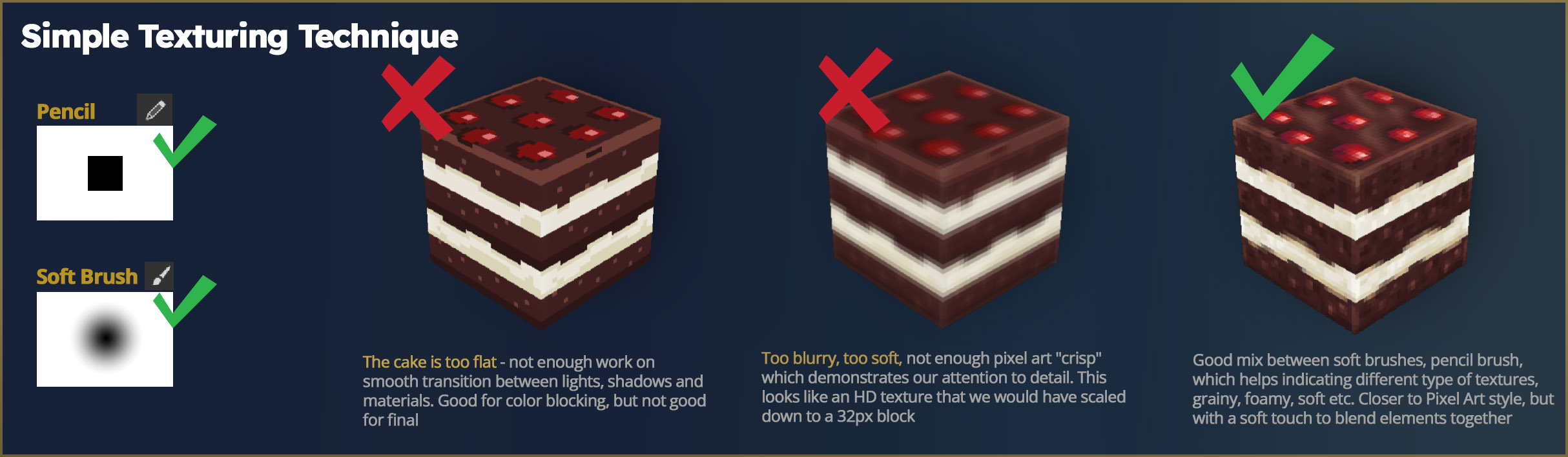 Version 3 (correcte) : combinaison des deux pinceaux. Le crayon définit les zones et les détails. Le pinceau doux crée les transitions et le volume. Le résultat final est granuleux et texturé, proche du style pixel art authentique, mais avec suffisamment de douceur pour éviter un rendu trop géométrique.
